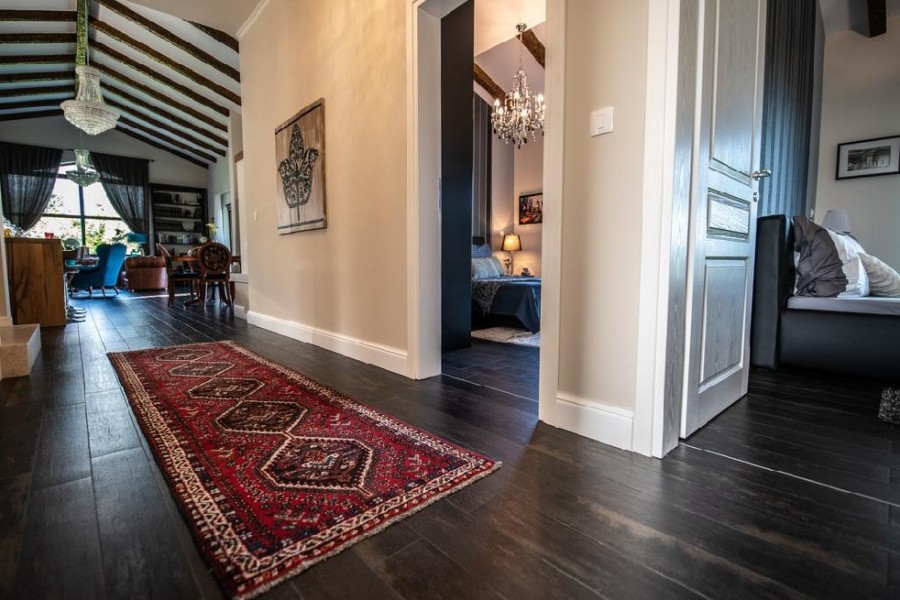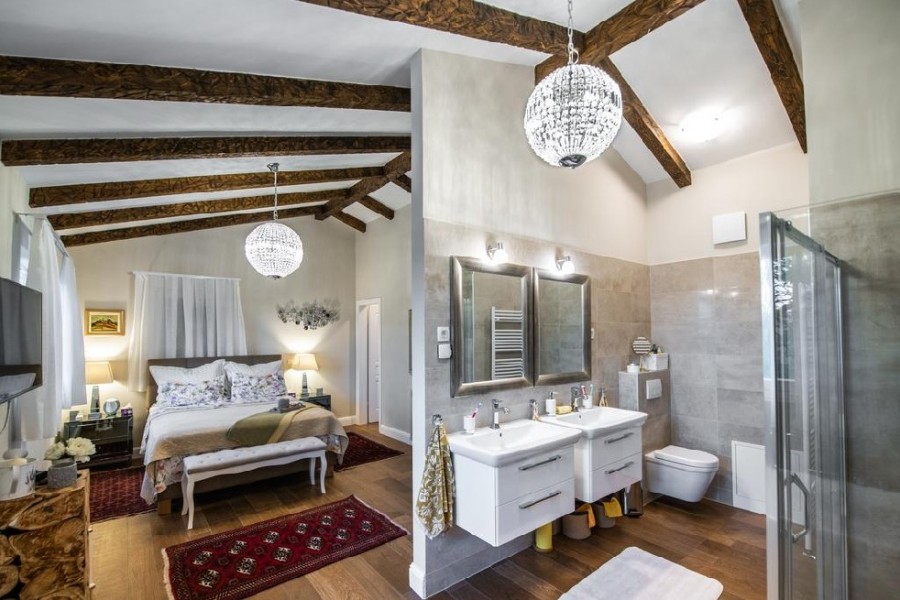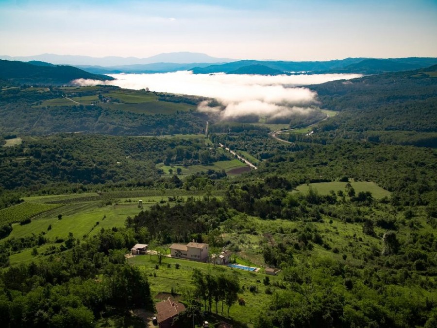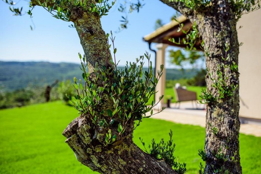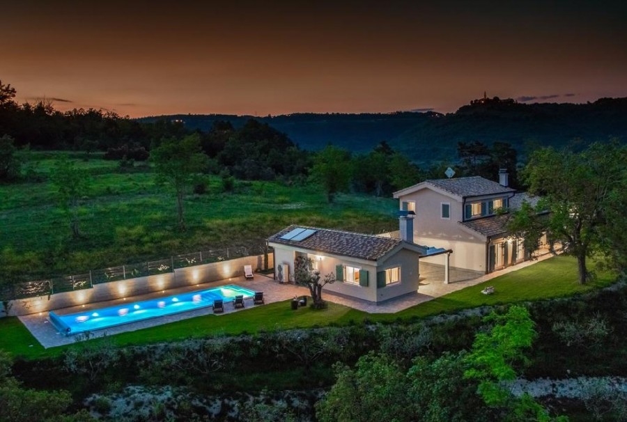 Luxus-Villa mit einer der schönsten Aussichten in Istrien befindet sich in einem kleinen Dorf in der Nähe von Buje, bietet einen herrlichen Blick auf die mittelalterlichen Städte Motovun und Grožnjan. Vom 14 m langen Schwimmbecken aus können Sie den Blick auf das Flusstal des Flusses Mirna, das Wildreservat und den Wald von Motovun genießen, der für seinen berühmten istrischen Trüffel bekannt ist. Das gesamte 3.000 m2 große Grundstück ist eingezäunt und liegt verkehrsgünstig zu anderen Häusern. Das Anwesen ist von einem Olivenhain umgeben, der sich über zwei Kaskaden erstreckt. Dies ist ein neu gebautes Anwesen, das nach umweltfreundlichen Prinzipien gebaut wurde und nur natürliche Materialien wie Stein und Holz verwendet. Der Garten ist mit heimischen aromatischen Pflanzen wie Lavendel, Rosmarin und Salbei dekoriert, die den ganzen Tag über unglaubliche Düfte verströmen. Die Hauptvilla verfügt über 3 Schlafzimmer mit en-suite Badezimmern, alle mit einer schönen Aussicht. Das 60 m² große Wohnzimmer verfügt über eine luxuriöse Küche mit modernster Technik und eine Kücheninsel. Die Küche verfügt über einen großen Einbaukühlschrank, einen eingebauten Gefrierschrank, einen Weinkühler, eine große Mikrowelle, einen Induktionsherd, einen Dampfofen, eine Kaffeemaschine, einen Wasserkocher und einen Toaster. Es gibt auch ein Esszimmer mit Kamin und ein Wohnzimmer mit einem herrlichen Blick auf Grožnjan und den jahrhundertealten Olivenbäumen. Das Wohnzimmer hat zwei Fenstertüren, die zu einer Außenterrasse und einem schönen Rasen führen. Das Nebenhaus (Taverne) hat auch eine voll ausgestattete Küche mit einem Esszimmer, einem offenen Kamin, einem kompletten Badezimmer und einem separaten Schlafzimmer, alle mit maßgeschneiderten Designermöbeln. Die Zimmer bieten einen herrlichen Blick auf den Pool, Olivenhain, Motovun und Grožnjan. Die Villa ist mit dem modernsten Heiz- und Kühlsystem sowie mit Sonnenkollektoren und Fußbodenheizung in allen Bädern ausgestattet. Das Sonnenbad bietet eine friedliche und bezaubernde Aussicht. Es gibt eine große Außendusche. Es gibt auch einen überdachten Parkplatz für zwei Autos sowie alle zusätzlichen Einrichtungen wie Grillplatz usw.