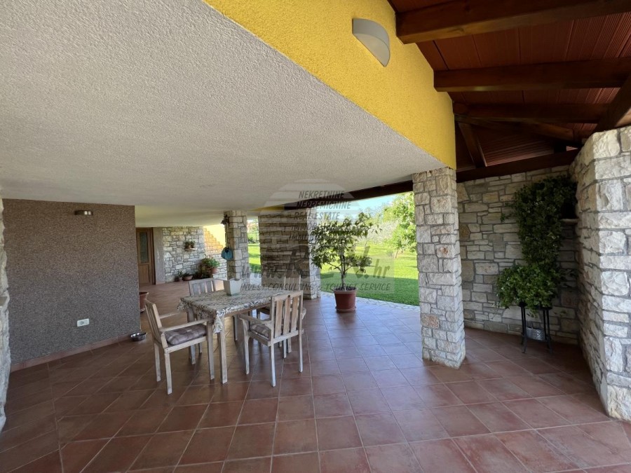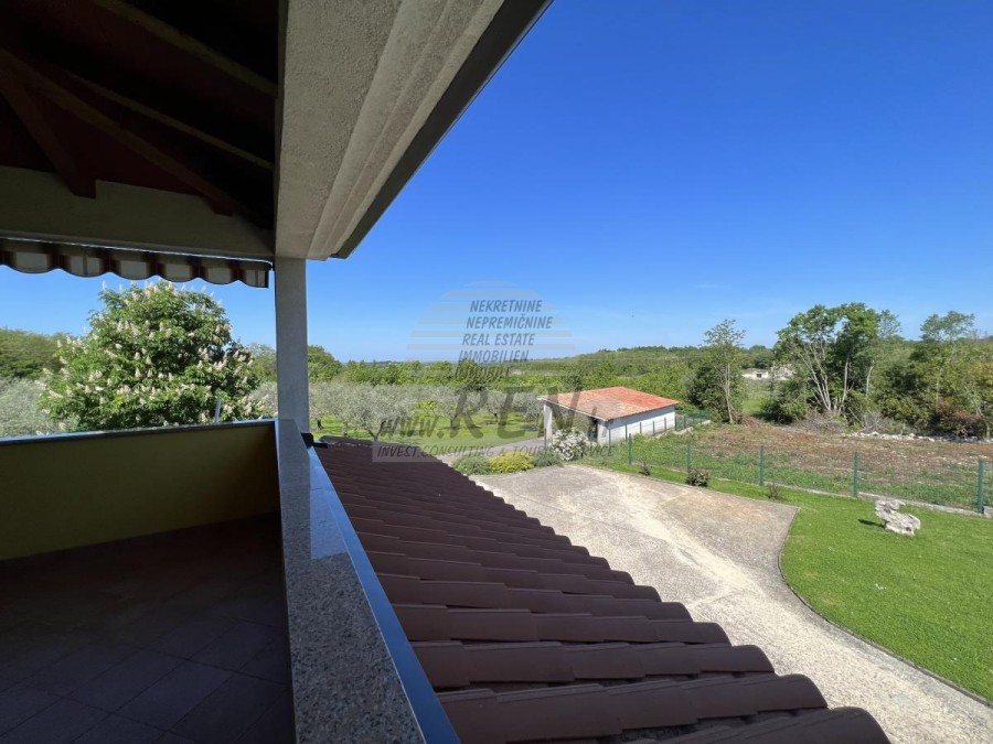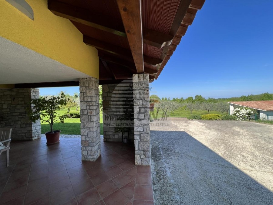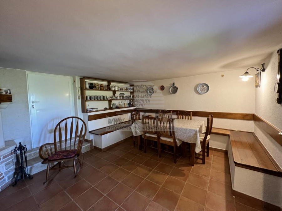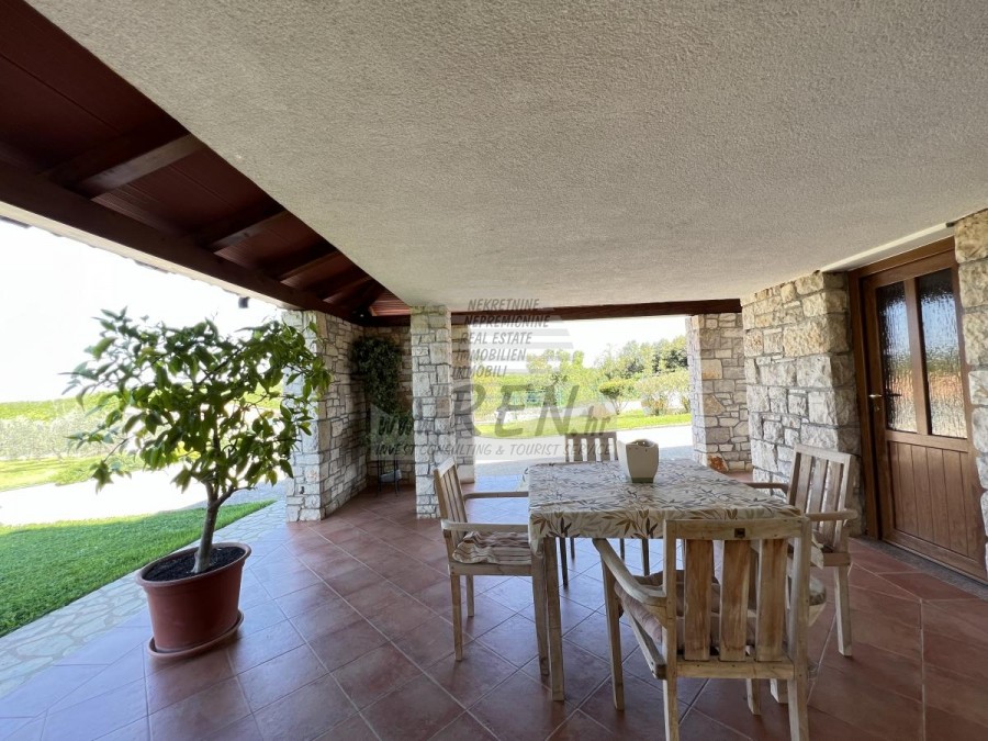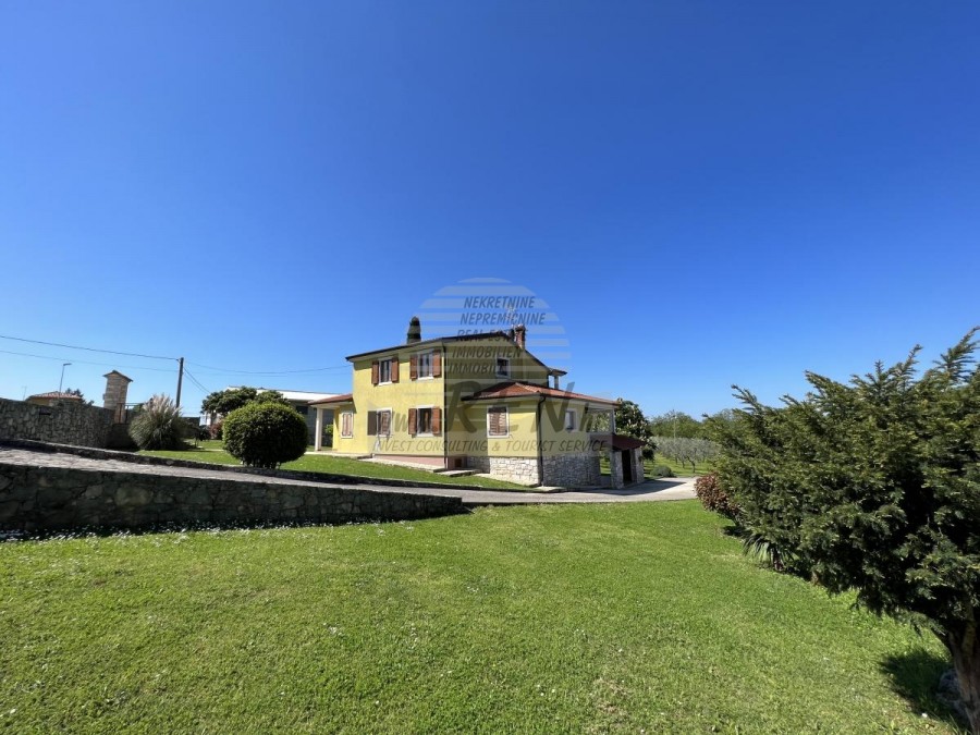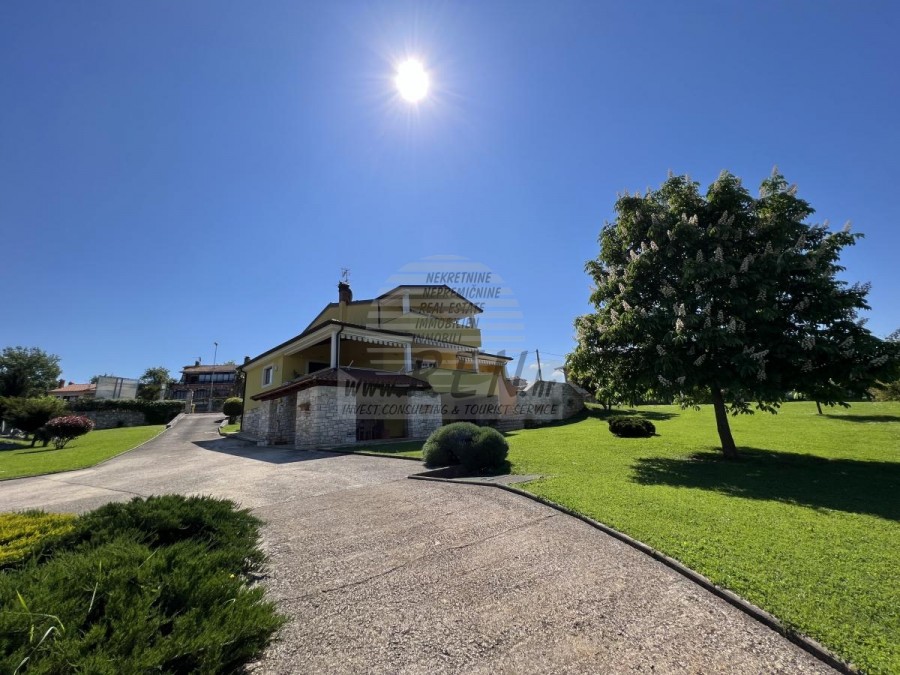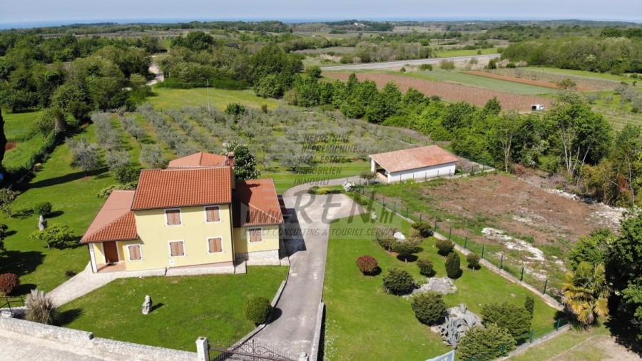 Das Haus in Brtonigla hat insgesamt 300 m2 + Garten 6137 m2, es ist 10 min. (6000m) vom Meer und von einem wunderschön angelegten Naturstrand, 5 Min. (500 m) vom Zentrum von Brtonigla entfernt. Das Haus verfügt über einen Keller, ein Erdgeschoss und einen ersten Stock. Im Erdgeschoss gibt es eine Terrasse von 66 m2, eine Eingangshalle mit Bad, ein Wohnzimmer mit Esszimmer (alles offen), eine Eingangshalle und eine Küche mit zusätzlichem Platz (Waschmaschine, Speisekammer usw.). ) und ein Schlafzimmer mit angeschlossenem Badezimmer. Unter der Innentreppe befindet sich ein weiterer geschlossener Abstellraum. Der Raum der Küche und des Zimmers kann durch eine Glasschiebewand geteilt werden. Vom Wohn- und Esszimmer gelangt man durch die Glaswände auf die Terrasse, ebenso von der Küche, die Zugang zur überdachten Terrasse hat, auf der man im Sommer speisen kann. Der Rest befindet sich im zweiten Stock, wo sich zwei Schlafzimmer mit jeweils eigenem Kleiderschrank befinden. Zwischen den beiden Zimmern befindet sich ein Badezimmer. Ein Zimmer verfügt über eine überdachte Terrasse mit Meerblick. Im Untergeschoss befinden sich eine Taverne mit Kamin und Küchenzeile, ein Abstellraum unter der Terrasse sowie ein Heizraum mit Toilette und der dazugehörigen überdachten Terrasse. Das Haus verfügt über eine Thermofassade, Gaszentralheizung, Klimaanlage, Böden aus massivem exotischem Holz, Küche und Badezimmer mit moderner Keramik. Auf dem Grundstück befindet sich auch ein Olivenhain mit etwa hundert Olivenbäumen. Das Grundstück ist komplett umzäunt. Auf dem Grundstück gibt es einen zusätzlichen Abstellraum (Garage von ca. 46 m2, teilweise geschlossen und teilweise überdacht).Das Haus ist nur 50 m von den Geschäften entfernt, 50 m vom Restaurant entfernt, 50 m entfernt vom Markt, ein Arzt 6000 m, Apotheke 6000 m, Pula Flughafen ist 70 km, Portorož Flughafen ist 20 km, Yachthafen Novigrad 8 km, und aquapark Istralandia ist nur 3 km.