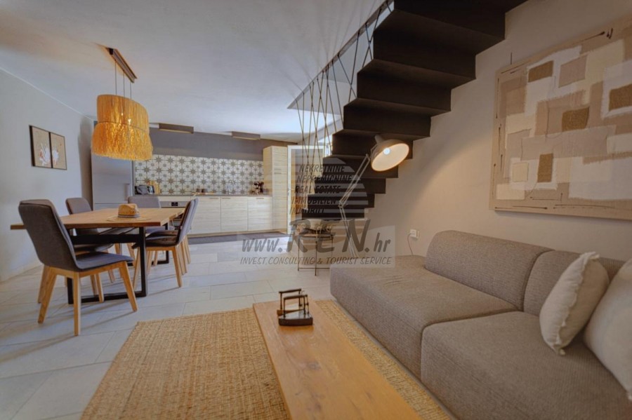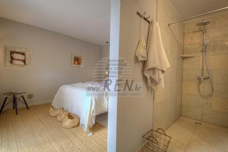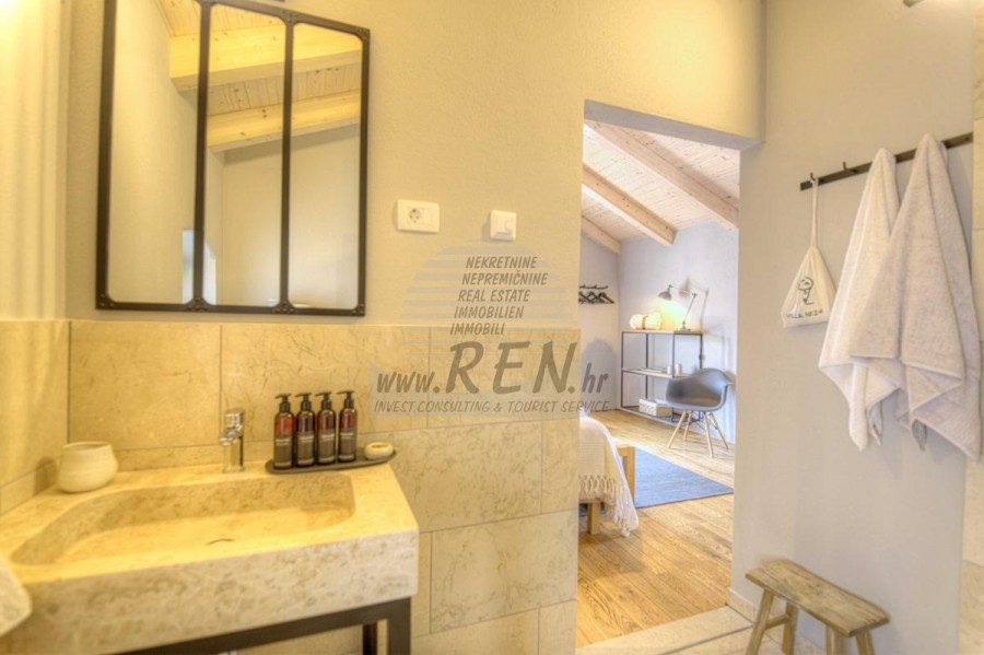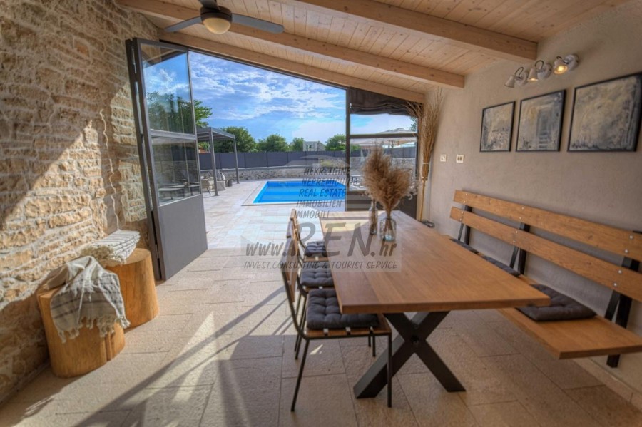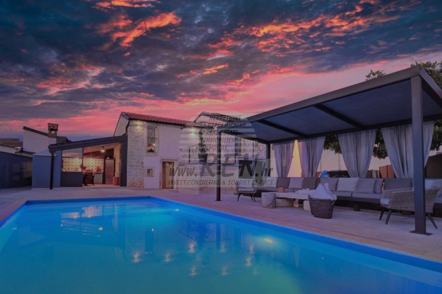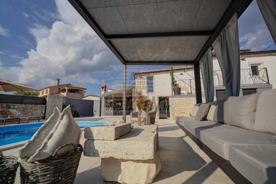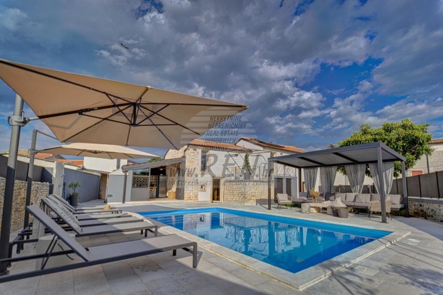 Die Villa hat insgesamt 100 m2, das Grundstück hat 450 m2, es ist 10 min. (10 km) vom Meer und von einem wunderschön angelegten Naturstrand, 10 Min. (10 km) vom Zentrum von Kanfanar entfernt. Das Haus ist freistehend und besteht aus 2 Etagen. Insgesamt gibt es 3 Schlafzimmer, Küche, Wohnzimmer, 3 Badezimmer. Alle Räume in der Villa sind klimatisiert. Das Haus verfügt über einen eigenen Parkplatz, einen Swimmingpool und eine Sommerküche.