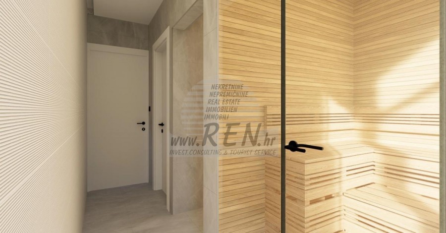 Das Erdgeschoss besteht aus einer Eingangshalle, einer Treppe für den Zugang zum ersten Stock und der Dachterrasse, einem Wohnzimmer, einer Küche und einem Esszimmer, einem Schlafzimmer mit separatem Badezimmer, einer zusätzlichen Toilette, einem Badezimmer und einer Sauna. ein Technikraum mit Waschküche, ein Abstellraum und eine Außentoilette, die jeweils über einen separaten Eingang verfügen.