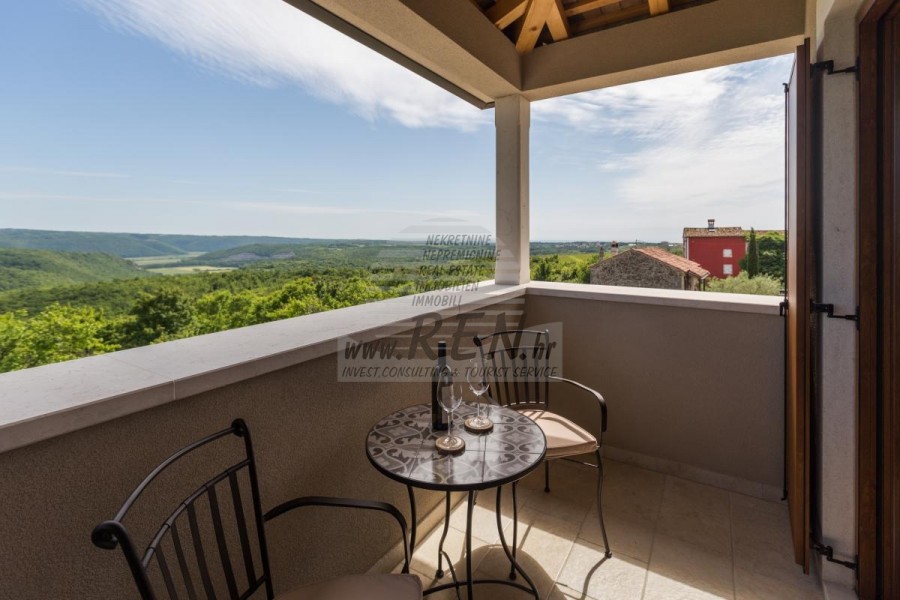 Zum Verkauf steht ein im istrischen Stil erbautes Haus mit schöner Aussicht in der Nähe von Buje. Die Wohnfläche beträgt ca. 150 m2, verteilt auf 2 Etagen und 1 Etage. Im Erdgeschoss befindet sich ein Heizraum mit Abstellraum, im Erdgeschoss befindet sich eine Gästetoilette, großes Wohnzimmer mit Küche und Esszimmer mit schöner Aussicht, Ausgang zur Terrasse, geräumiges Schlafzimmer mit Bad (ebenerdige Dusche) und Abstellraum, der als Waschküche genutzt werden kann, während sich im ersten Stock ein Flur / Lesezimmer und 2 Schlafzimmer, jedes mit eigenem Bad, eines mit ebenerdiger Dusche und das andere mit Badewanne, sowie einen Balkon befinden mit einem wunderschönen Blick auf die Natur und das Meer. Die ungefähre Fläche des Gartens beträgt 250 m2, die ein Schwimmbad von 30 m2, 2 Parkplätze, eine Sommerküche und eine Liegewiese umfasst. Beim Bau wurden hochwertige Materialien mit vielen Steindetails verwendet, die dem Haus das autochthone Flair verleihen, und das Gebäude selbst ist mit 4 Sternen (****) kategorisiert. Die Beheizung erfolgt über eine Fußbodenheizung, die sich über beide Etagen erstreckt, eine Klimaanlage in jedem Zimmer und Wohnzimmer, während im Wohnzimmer ein Palazzetti-Holzkamin steht, der neben der Heizung auch eine wunderbare Atmosphäre bietet. Das Haus hat eine sehr gute Auslastung in der Vorsaison, Saison und Nachsaison. Das Haus wird komplett möbliert verkauft.