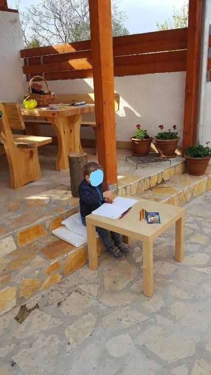 Küche, ein großes Esszimmer und ein Badezimmer. In der zweiten und dritten Etage