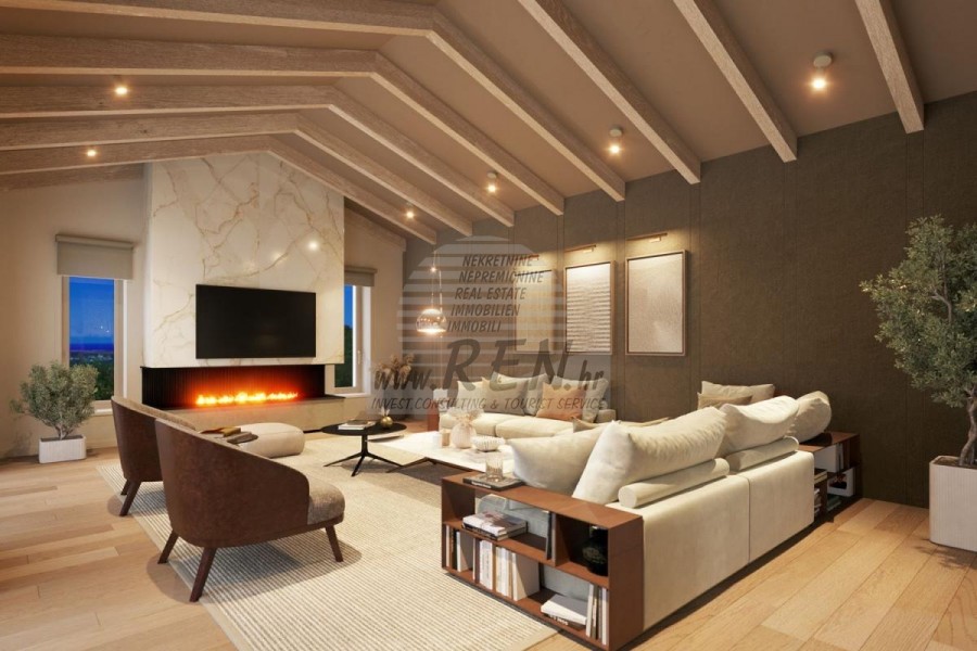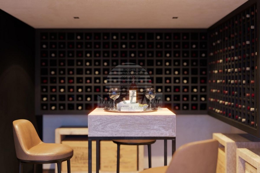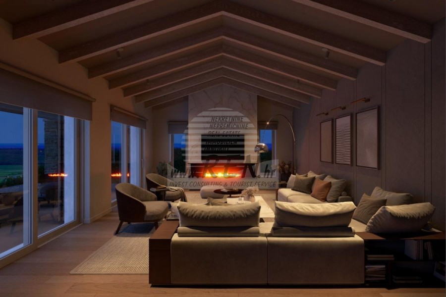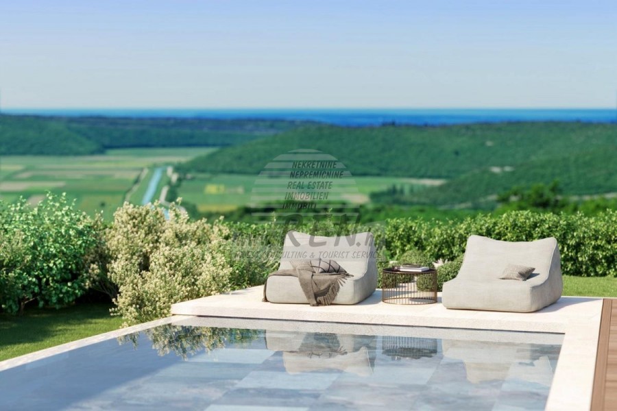 Die Luxusvilla mit einer der schönsten Aussichten in Istrien befindet sich in einem ruhigen und kleinen Ort in der Nähe von Buje, von wo aus man einen zauberhaften Blick auf den Berg Učka, den Fluss Mirna und das Meer und sogar die Alpen hat. Während Sie im Pool schwimmen, können Sie die Aussicht auf das Tal des Flusses Mirna, das Jagdgebiet und den Motovun-Wald genießen, der für den berühmten istrischen Trüffel berühmt ist. Komplettes Grundstück von 1500 m2 eingezäunt und abseits von anderen Häusern. Es ist von einem Olivenhain umgeben. Das Anwesen ist nach ökologischen Maßstäben neu gebaut, ausschließlich mit Naturmaterialien wie Stein/Holz, der Garten ist ausschließlich mit heimischen Pflanzen, Olivenbäumen geschmückt. Die Villa verfügt über 3 Schlafzimmer mit angeschlossenen Badezimmern. Die Wohnfläche umfasst 80 m2 und umfasst eine luxuriöse Küche mit einer Kochinsel, die mit modernster Technologie ausgestattet ist. Außerdem gibt es ein Esszimmer, sowie ein Wohnzimmer mit Kamin und einem wunderschönen Blick auf das Meer und es verfügt über zwei Flügeltüren, die zur Außenterrasse, zum Sonnenbereich, zum Swimmingpool, zur Sommerküche und zum Rasen führen. In der Keller befindet sich ein Wellness- und Fitnessraum, der ebenfalls eine schöne Aussicht bietet. Alle Möbel sind von Designern signiert und nach Maß gefertigt. Die Anlage ist mit dem modernsten Zentralheizungs- und Kühlsystem sowie Sonnenkollektoren ausgestattet, und alle Badezimmer verfügen über Fußbodenheizung. Neben Sonnenbaden, bezaubernder Aussicht und Ruhe bietet der Pool auch eine besonders große Außendusche. Das Anwesen hat auch Parkplätze für fünf Autos, sowie alle zusätzlichen Einrichtungen wie; Grill im Freien.