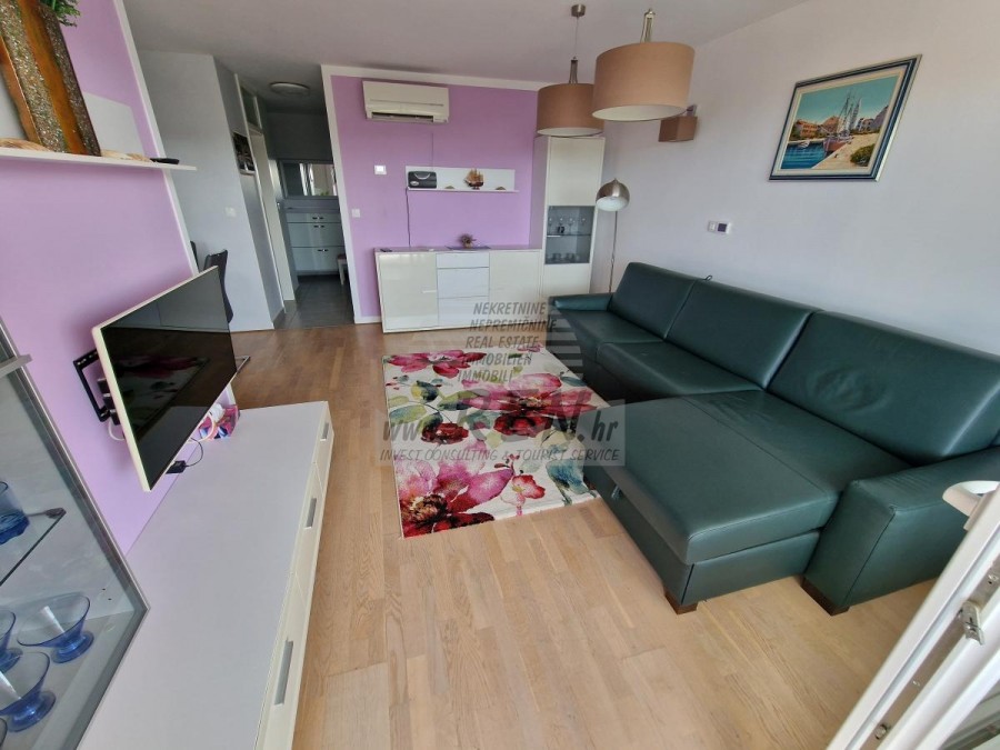 Die Wohnung in der Nähe von Umag hat eine Gesamtfläche von 52,80 m2, liegt im zweiten Stock, wurde 2013 erbaut und ist 5 Min. (200 m) vom Meer und vom angelegten Strand, 10 Min. (4000 m) vom Zentrum von Umag entfernt. Die Wohnung besteht aus einer Küche mit Esszimmer, Wohnzimmer, Badezimmer, Schlafzimmer, Flur, Terrasse. Es ist mit Klimaanlage, Aufzug, Privatparkplatz und Meerblick ausgestattet. Es wird mit Möbeln verkauft.
