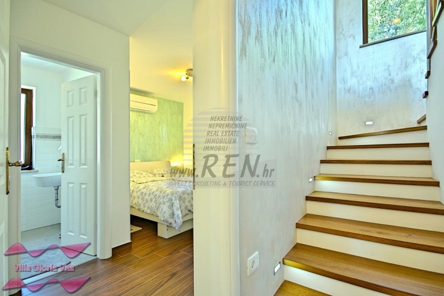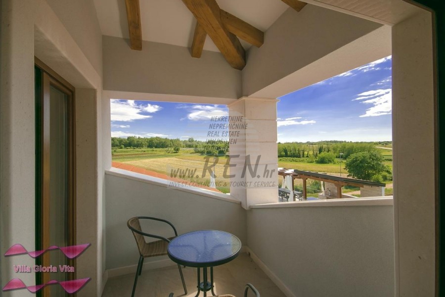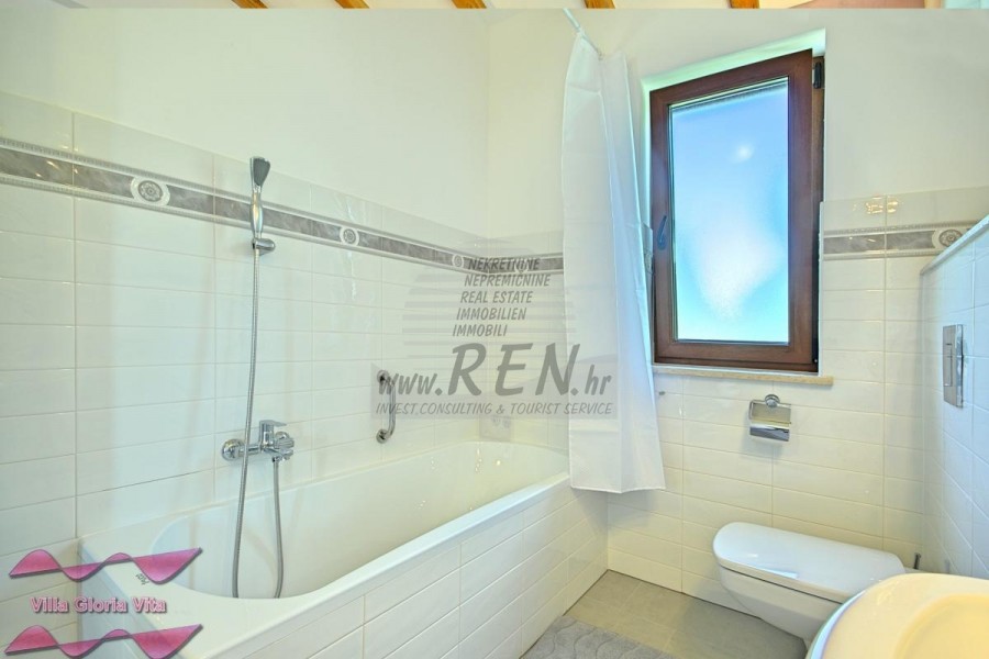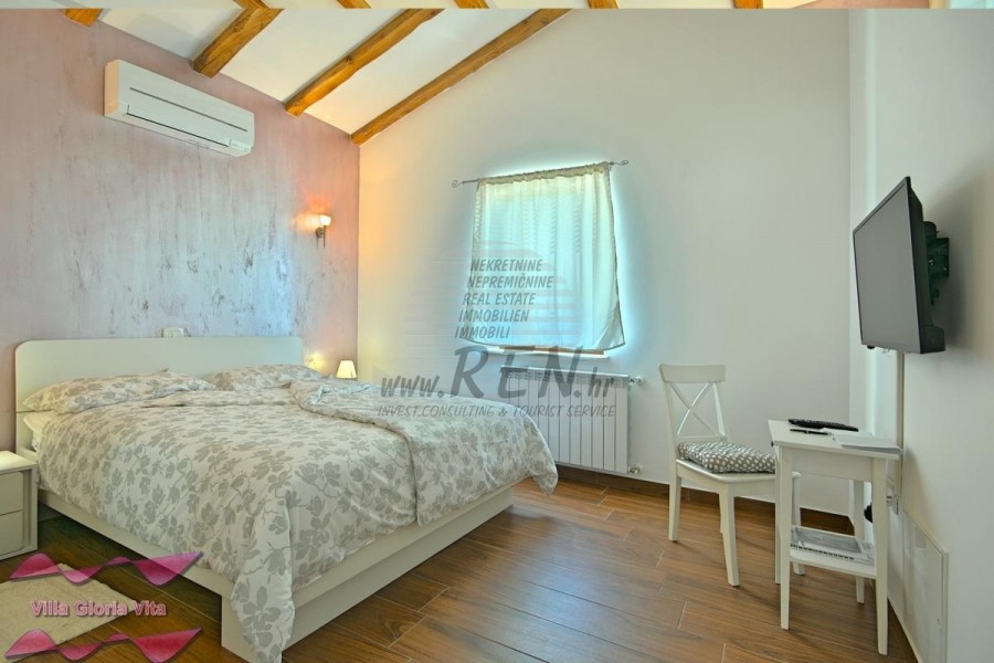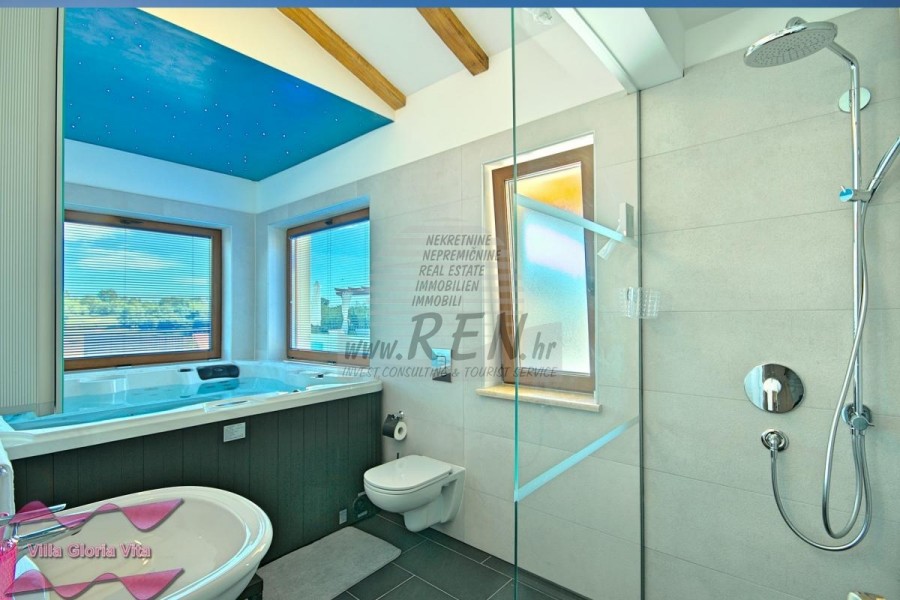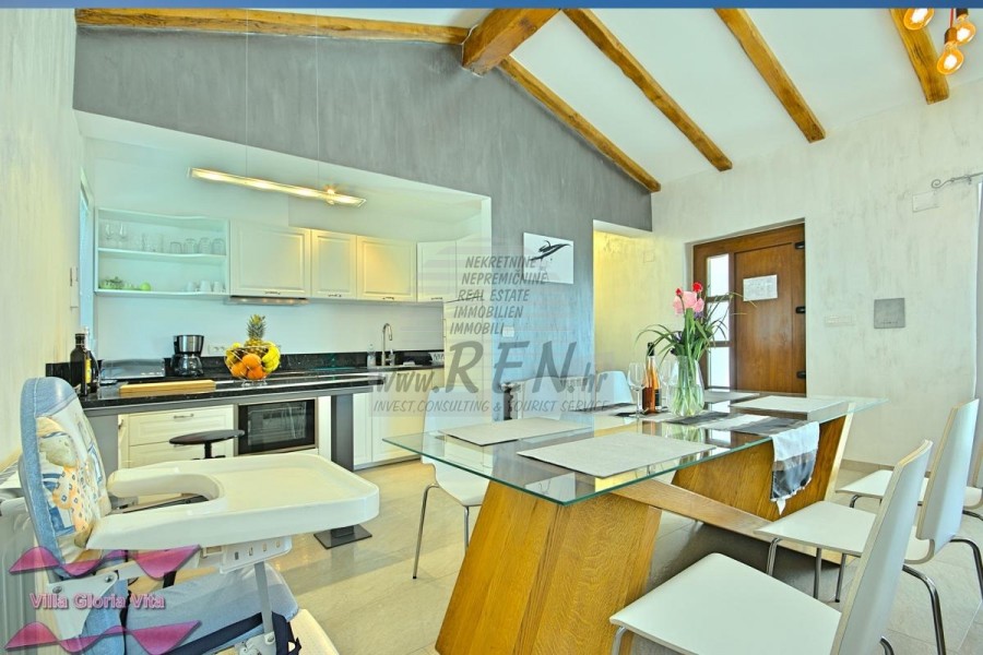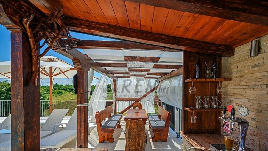 Zum Verkauf steht ein Haus mit Swimmingpool, 2 km vom Zentrum von Brtonigla und 7 km von Novigrad entfernt. Das Haus befindet sich in ruhiger Lage und hat 203 m2. Das Haus ist in 2 Etagen aufgeteilt und besteht aus Erdgeschoss und 1. Stock. Im Erdgeschoss gibt es ein gemütliches Wohnzimmer, eine Küche mit Esszimmer, 2 Schlafzimmer, eine Waschküche, 2 Badezimmer und ein Zimmer mit Whirlpool. Auf der ersten Etage befindet sich ein Schlafzimmer mit Zugang zu einer überdachten Terrasse, ein Kleiderschrank und ein Badezimmer. Das Haus hat einen wunderschön angelegten Garten von 538 m2, in dem sich ein Swimmingpool von 19 m2 und eine überdachte Sommerküche befinden. Das Haus verfügt über eine separate Taverne für Geselligkeit mit einem Schlafzimmer und einem Badezimmer. Jeder Raum im Haus ist mit Klimaanlage ausgestattet, außerdem gibt es eine Solarheizung über eine elektrische Wasserpumpe und eine Zentralheizung über einen Kamin. Das Haus verfügt über 3 überdachte Parkplätze. Das Haus wird touristisch vermietet und hat eine sehr gute Auslastung in der Vor-, Nach- und Nachsaison. Die Entfernung zum Meer und dem schön geschmückten Strand beträgt 7 km.