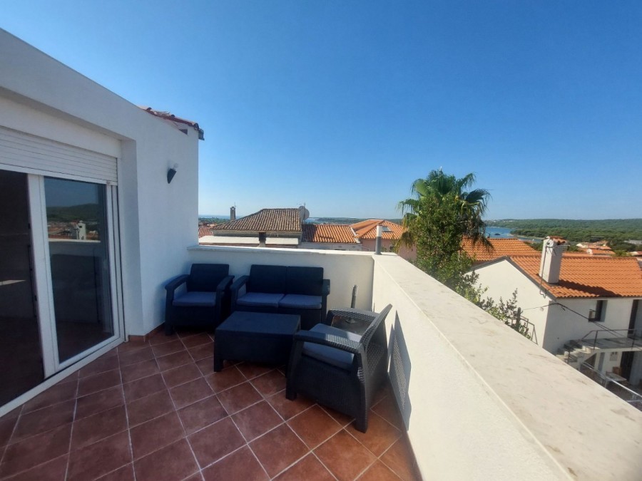 Es besteht aus zwei separaten, eingetragenen Wohneinheiten. Die erste Einheit ist ein Einzimmer-Apartment im Erdgeschoss, bestehend aus Wohnzimmer mit Küche, Badezimmer und Schlafzimmer. Die zweite Einheit ist eine großzügige Wohnung, die sich über drei Etagen erstreckt. Im ersten Stock befinden sich Wohnzimmer mit Küche, Badezimmer und Schlafzimmer. Im zweiten Stock gibt es ein großes Schlafzimmer sowie eine Terrasse mit wunderschönem Meerblick. Die dritte Etage bietet eine große Terrasse mit Panoramablick auf das Meer.